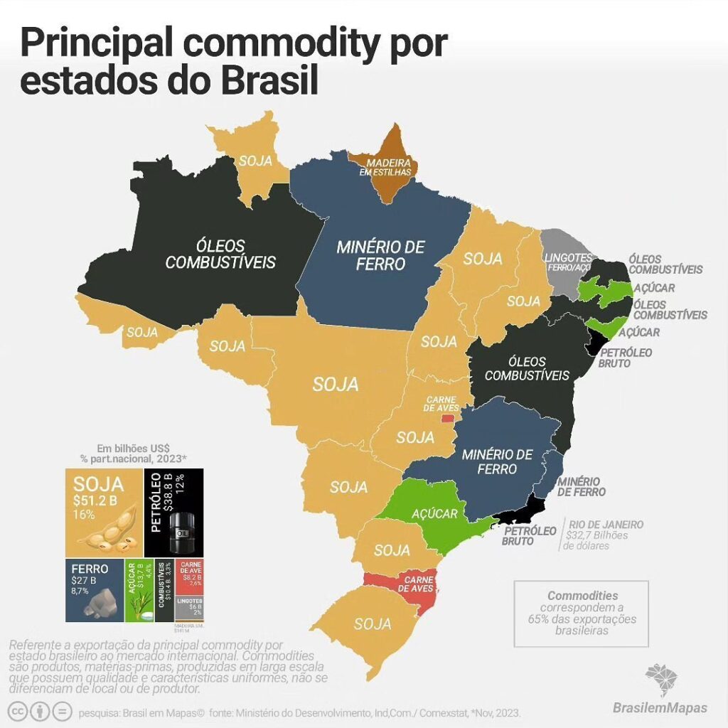 Cerca de 65% das exportações brasileiras são commodities. A maior parte das commodities são das categorias agrícola e mineral. Cerca de 50% são produtos do agronegócio.